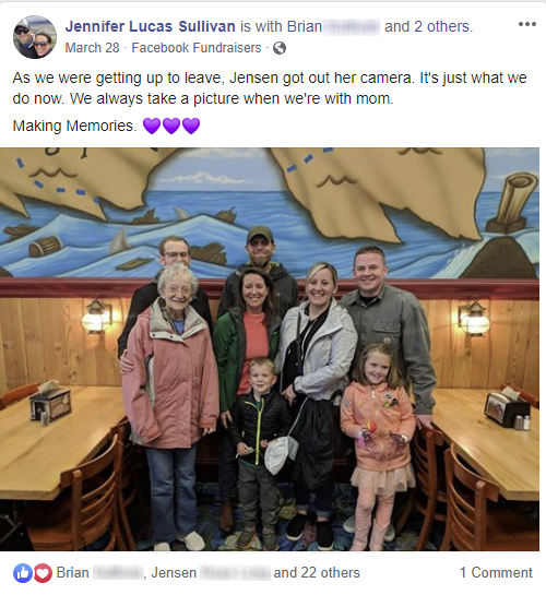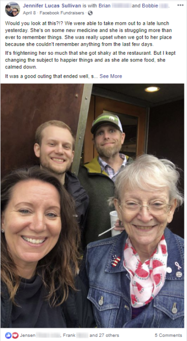 A few days later, I posted on my fundraiser Page. We take my mom to dinner every Wednesday and I always take a photo when I see her, so this is a picture of that. It was a good day because my mom hadn’t been able to go out at all the few days before this dinner. This photo below received 29 likes and 5 comments and it was posted on April 8, 2019.