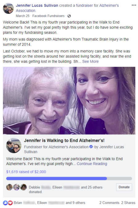 I continued fundraising and posting and was also mixing in personal posts on my regular Facebook profile. This is a post about my mom that I put on my Facebook profile and it got 38 likes, 23 comments and 2 shares. I really tried to keep the balance between just posting about Alzheimer’s and posting about regular life stuff.
