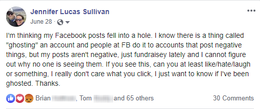 One person liked this post on my personal page. One. And the comment is me, posting about how sad it is that my fundraising posts aren’t being seen. The share was my sister, who again, shared it, it looked fine, but when she went back to her Facebook news feed it was gone. She commented on her shared post “I tried, but this post disappeared, too.”
